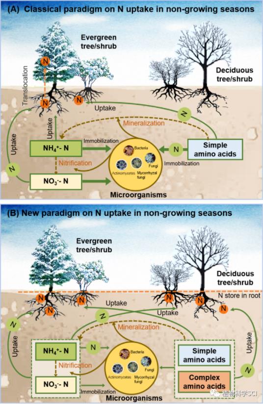 (A)传统的冬季氮吸收概念模型;(B)修正后的冬季氮吸收概念模型。